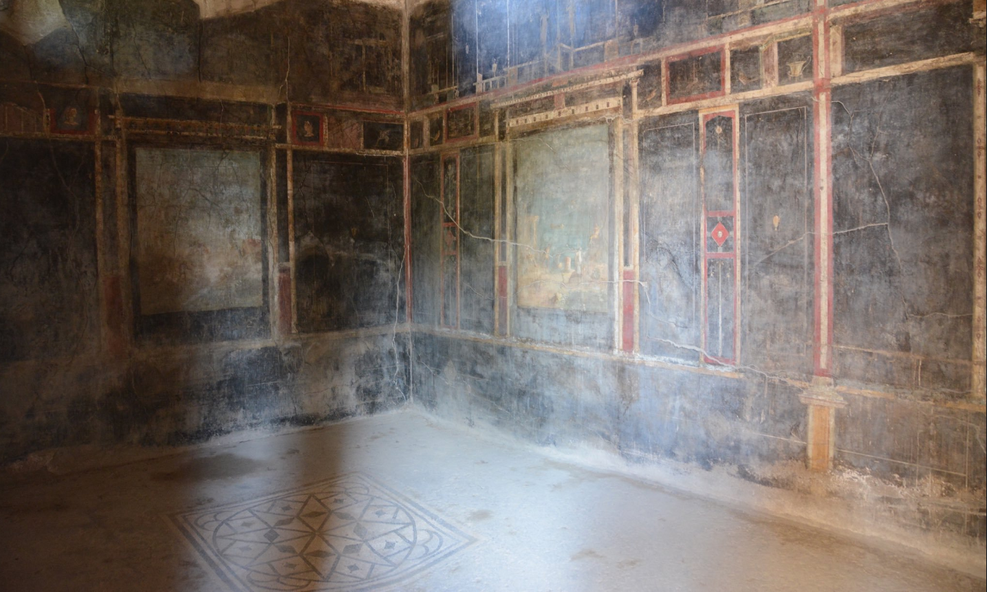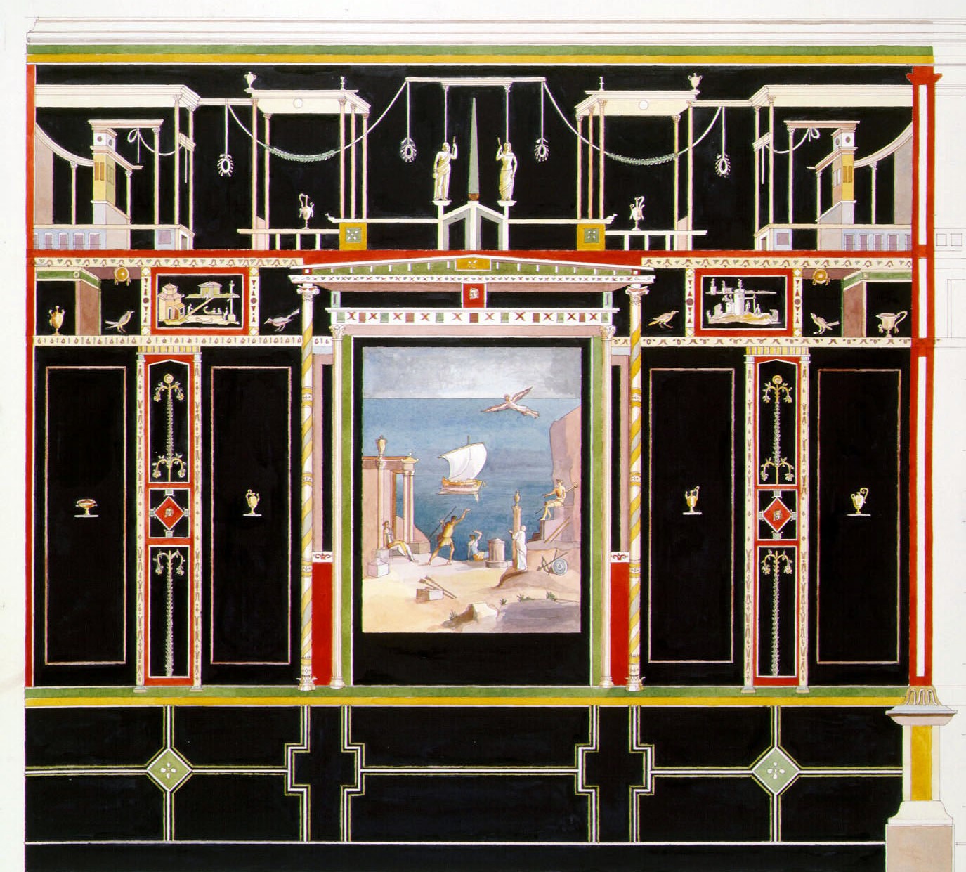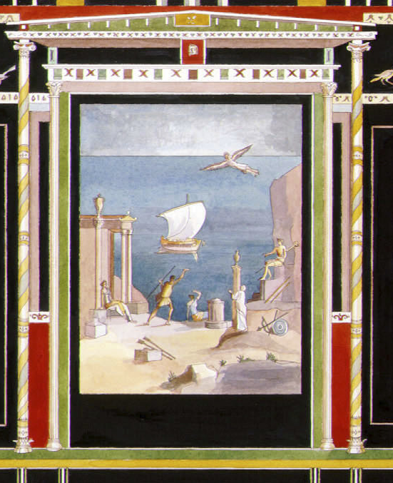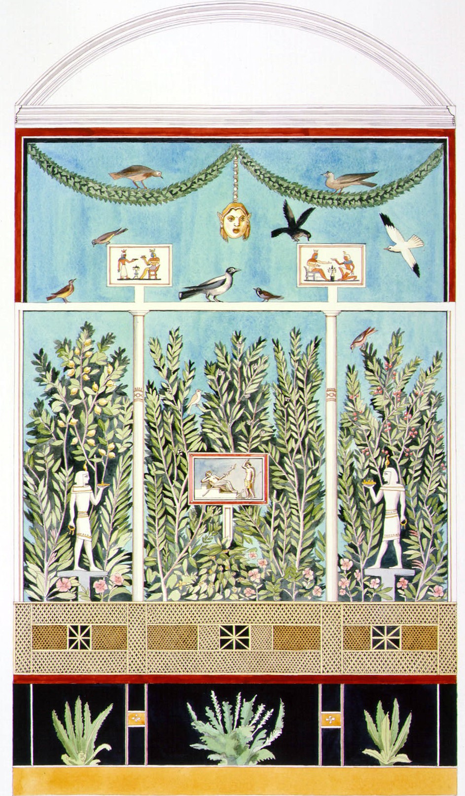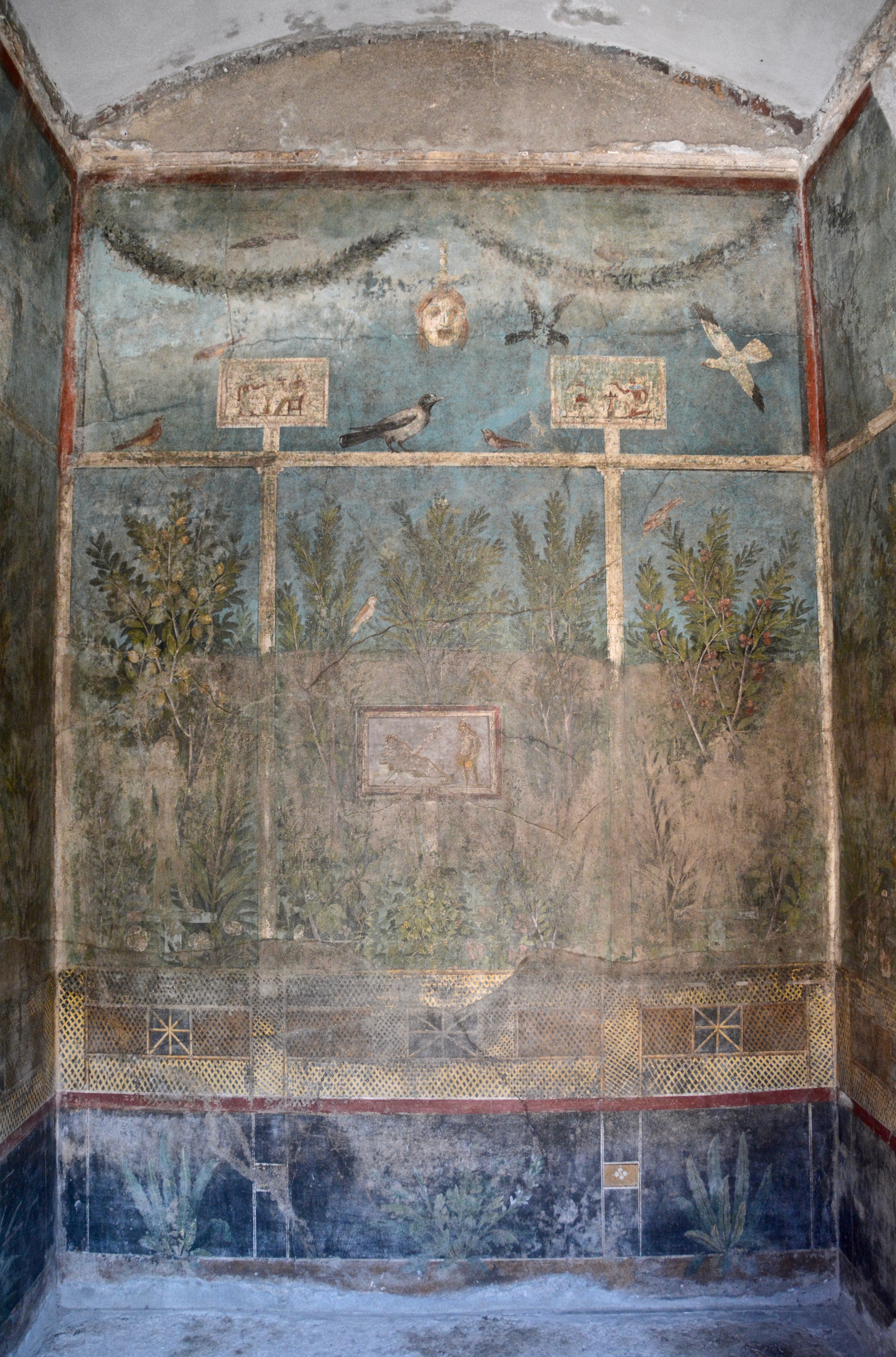 The most famous features of this House are the lavish decoration found in three of its rooms; two cubicula (small rooms, often bedrooms) (7, 8) and the dining room (9). The inside of room 7 has a floor design made of tiny tiles (a mosaic) and wall paintings of garden scenes with birds, flowers, statues and fountains. Included in this design are Egyptian motifs, showing that the owner knew of Egypt and its art, and perhaps wanted to make their house and tastes feel exotic. Room 8 is decorated in a similar style with trees, birds, snakes and other animals. The dining room (9) contains panels showing various myths including Daedalus and Icarus and the Seven Against Thebes. Roman houses were often decorated with landscapes, nature and mythological images.