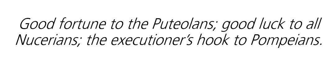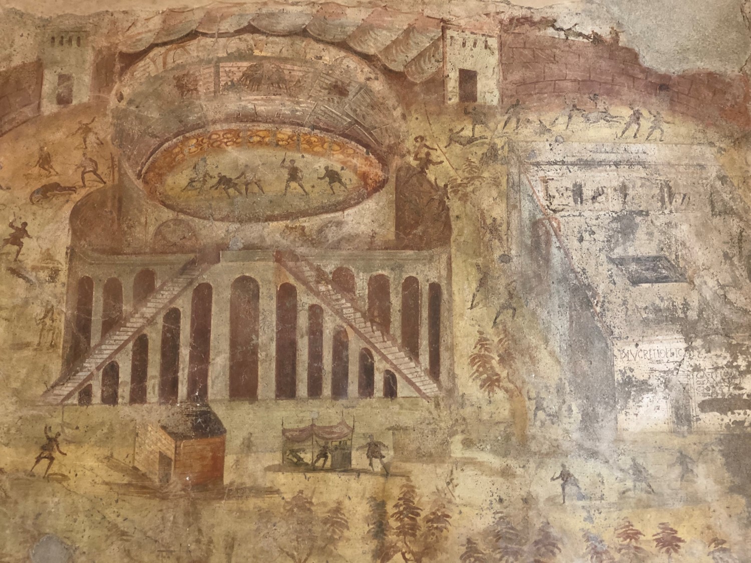 This wall painting (fresco) probably shows the riot between spectators from Pompeii and nearby Nuceria in Pompeii’s amphitheatre in AD 59. It was found in the House of Actius Anicetus (also sometimes called House of the Amphitheatre Painting), which is in the same region of Pompeii as Amarantus’s insula but a few blocks away.