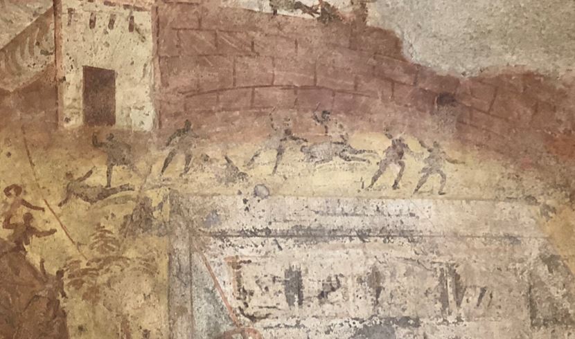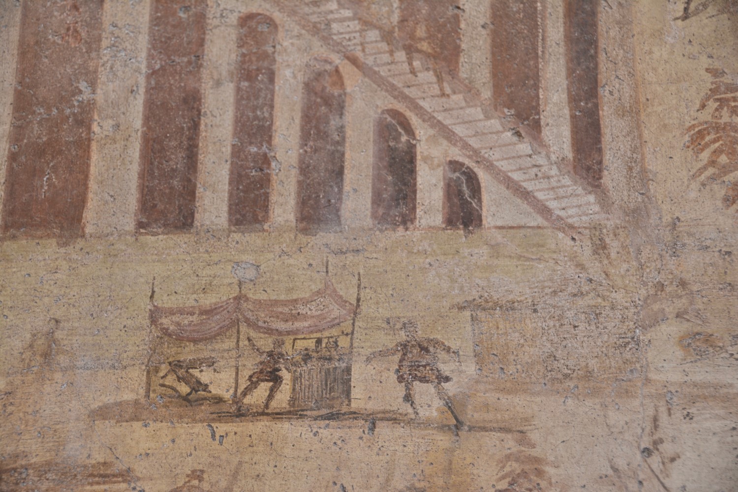 The painting looks down on the amphitheatre from above without the whole awning over the top, so we can see inside. Around the outside there are trees and stalls and the town walls are visible. On the right hand side is the Large Palaestra (gymnasium) with a large swimming pool inside. The painting shows fights breaking out not only in the arena, but in the surrounding area as well. Some of the figures are holding weapons or throwing stones, others appear unarmed.