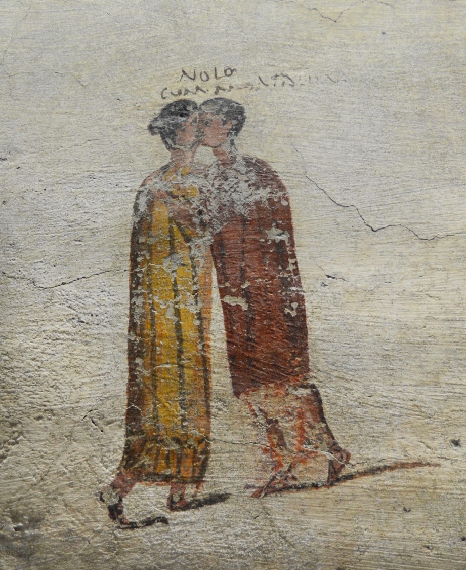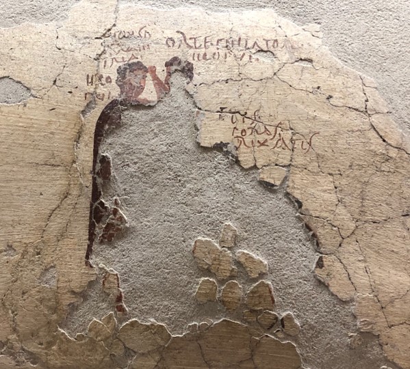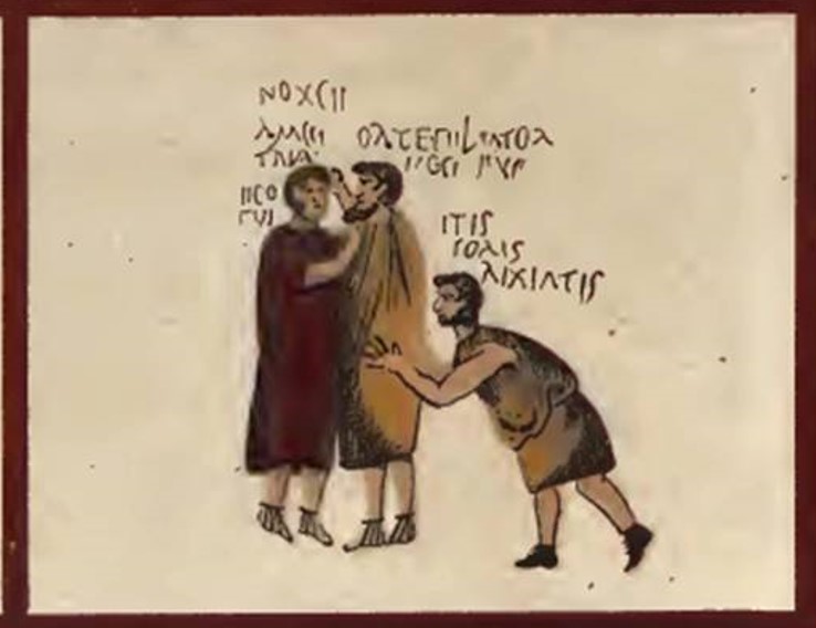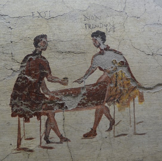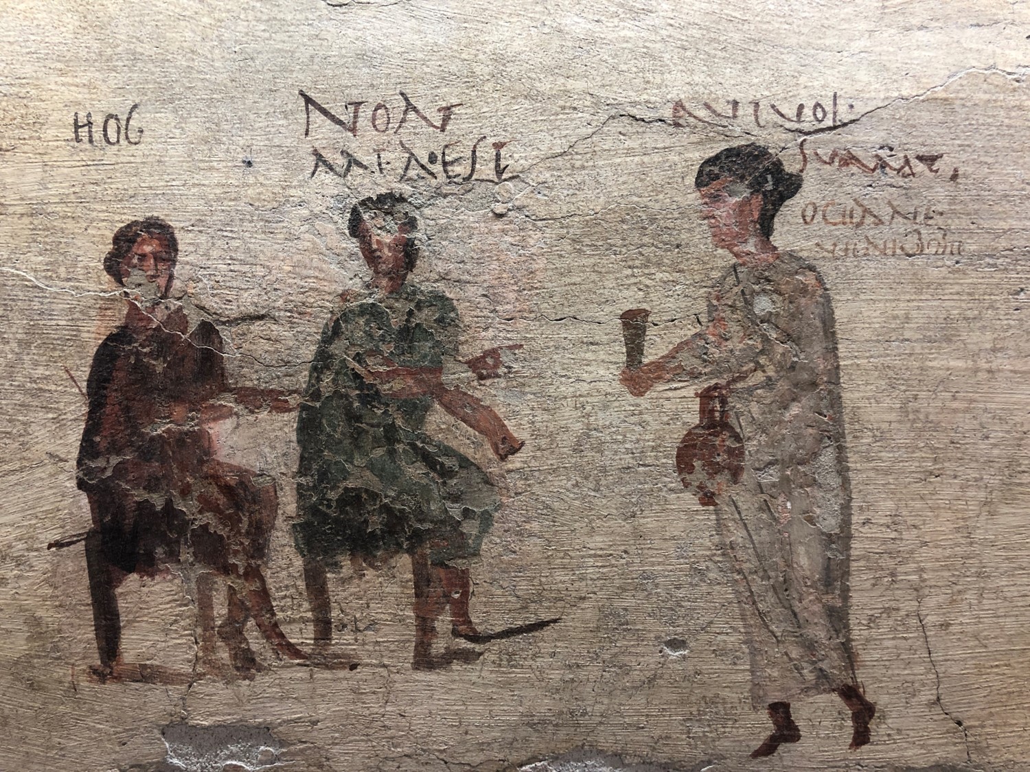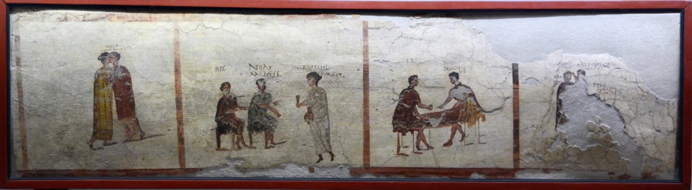 These four pictures form a kind of ‘cartoon’ depicting life in a Pompeian bar. They seem to have been painted quickly and with far less skill than the beautiful wall paintings (frescoes) in the wealthy houses. They give a rare glimpse into the language and life of Pompeii’s lower classes.