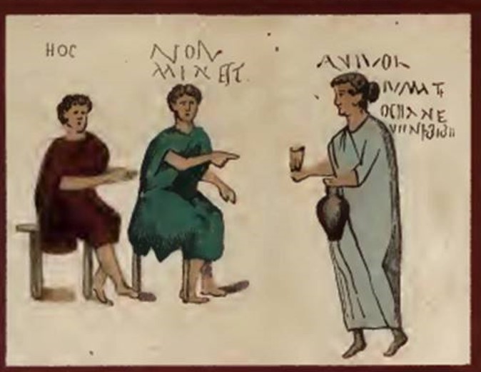This shows two men sitting in a bar, a barmaid approaches them carrying a cup and jug of wine.