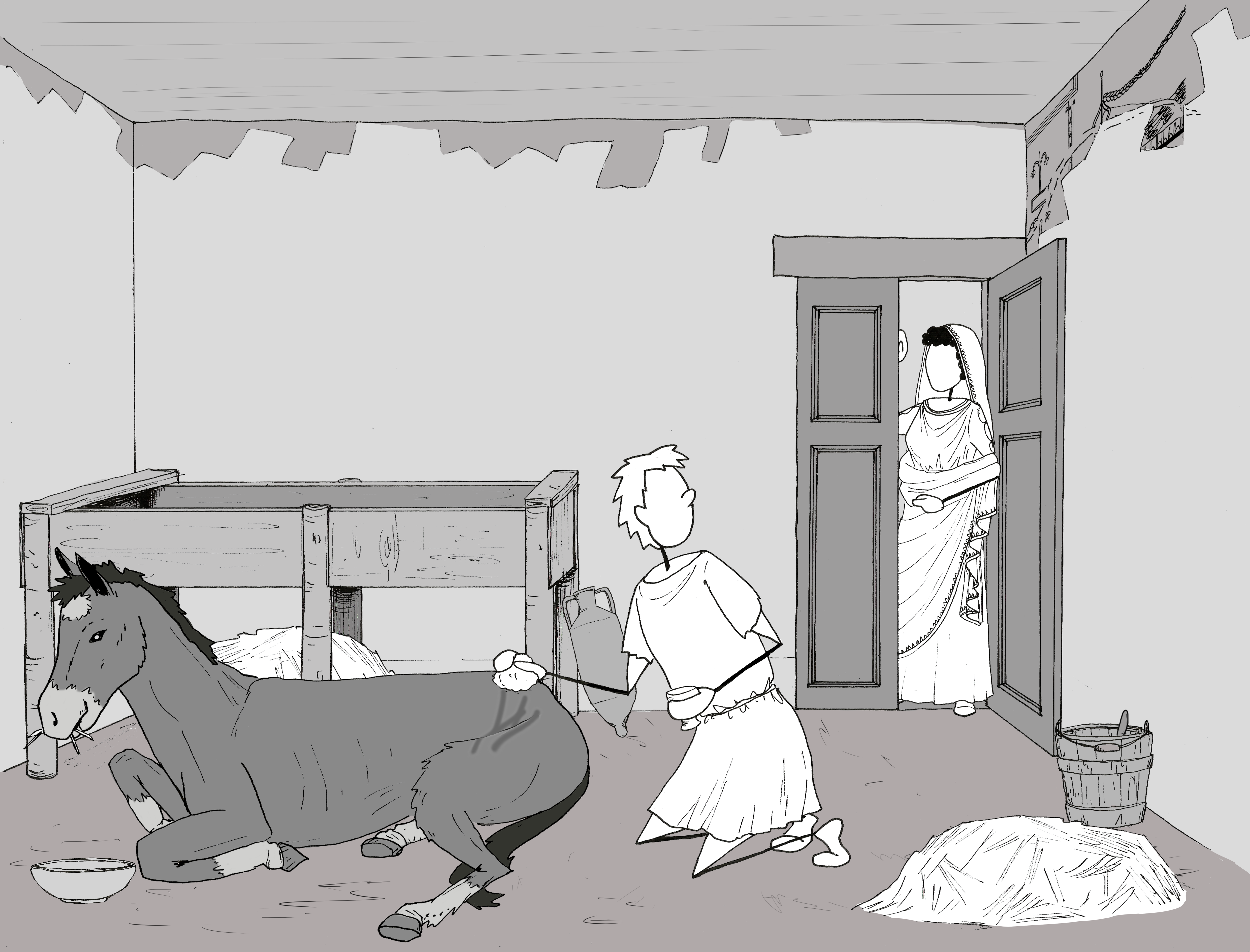 The next morning Amarantus kneels beside Potiscus, who is reclining on the floor of his bedroom. He is gently bathing the mule’s welts in wine and olive oil. |