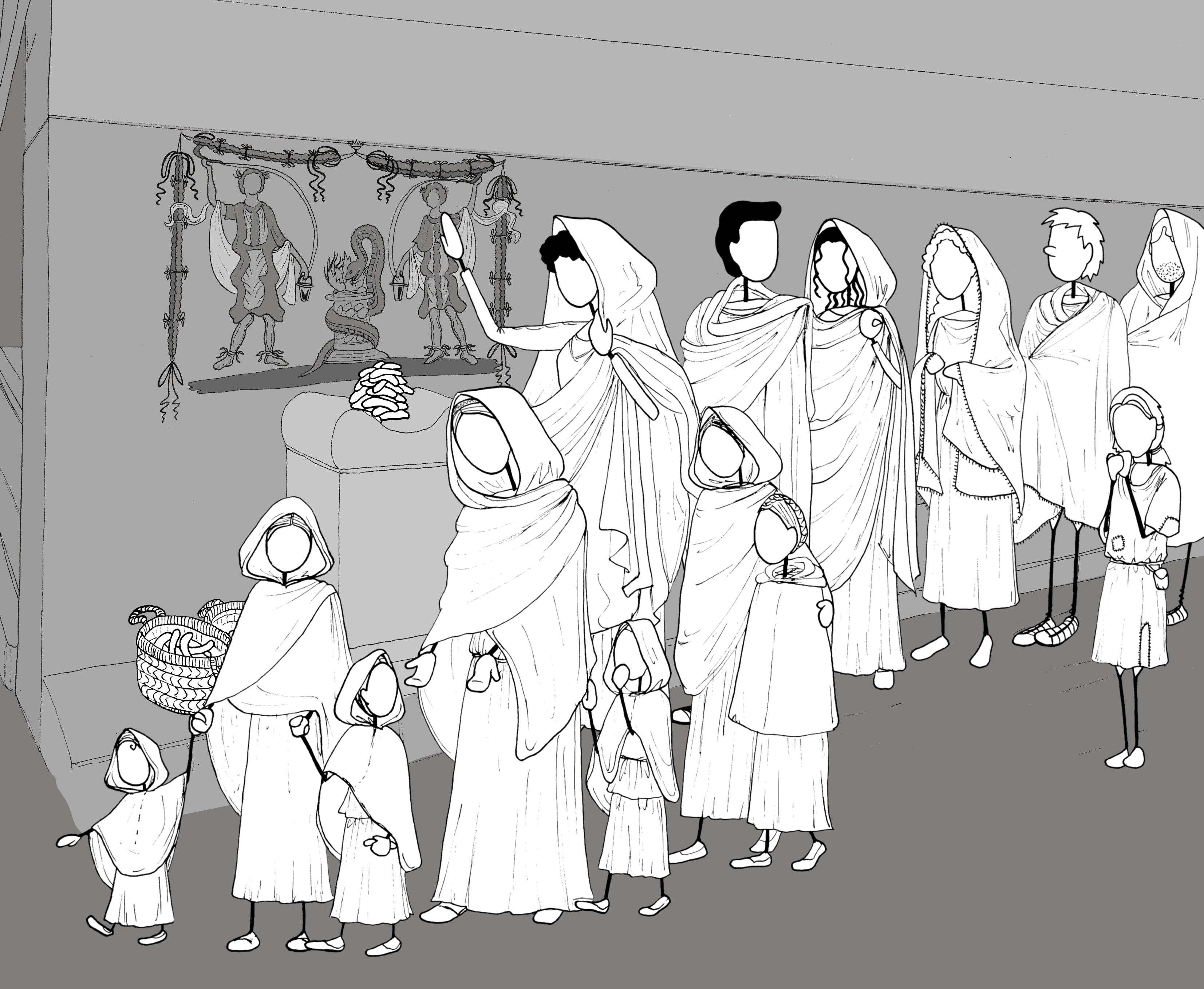 When their part of the queue finally reaches the shrine, Pompeia places her cake reverently on the altar along with a dozen more, and then looks at the two painted Lares with affection. As a Roman matron, she doesn’t often come out here. But she grew up in this insula and as a girl she sometimes offered to fetch water for a chance to get outside and hear the other girls’ gossip. She has known these Lares all her life.