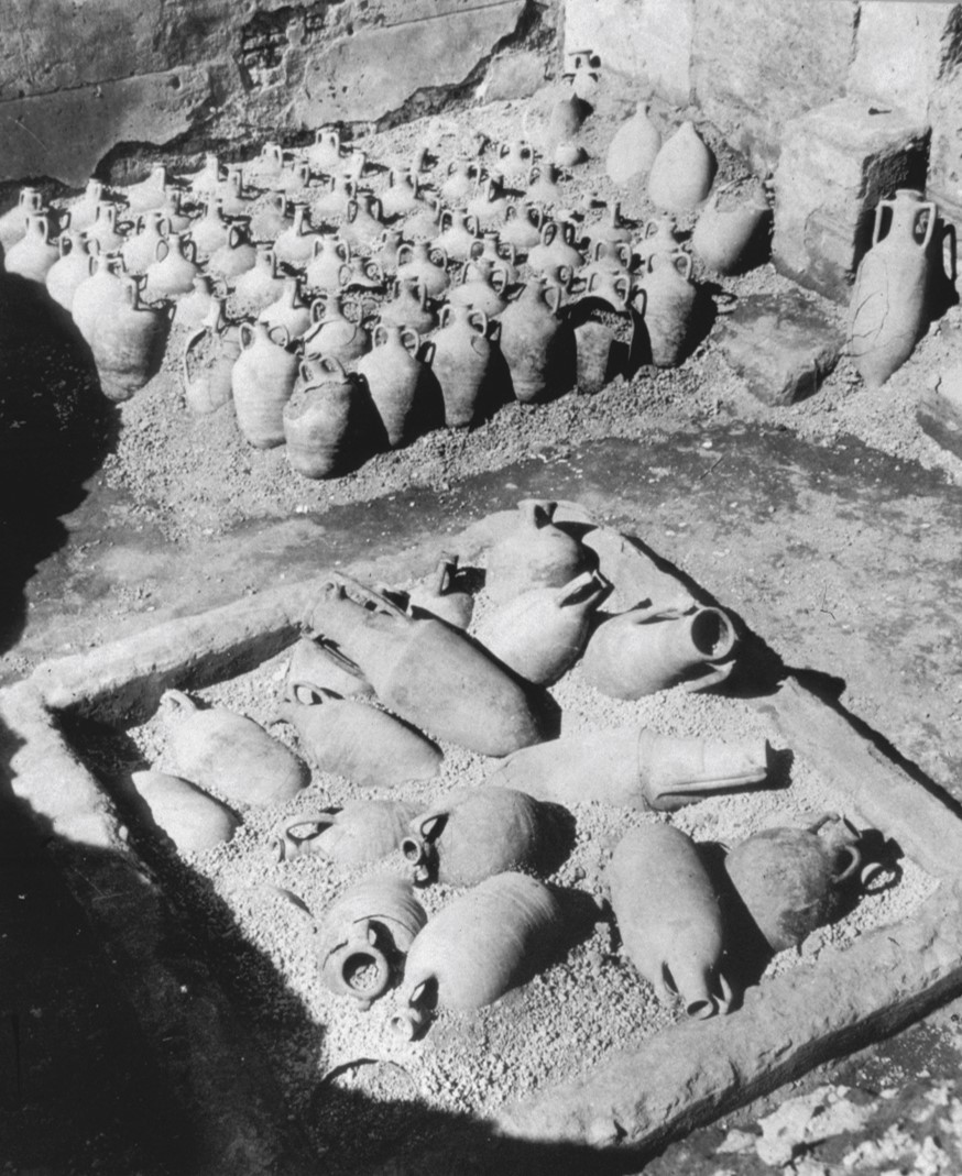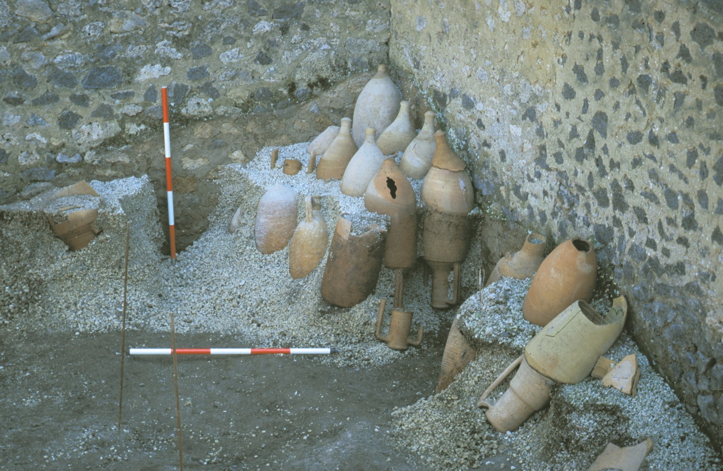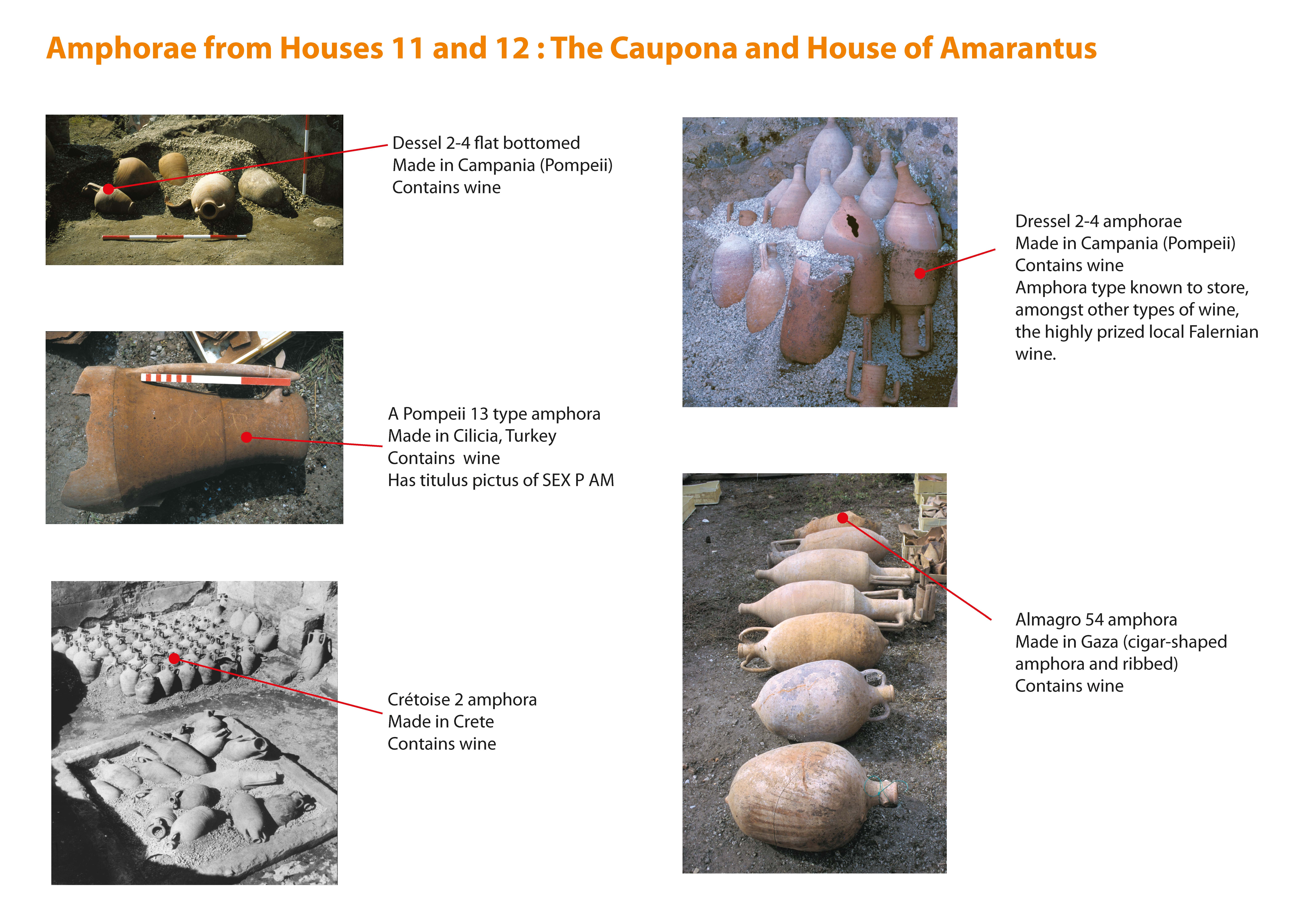 As has been touched upon in other Topics, many amphorae were recovered from both the bar and House of Amarantus. The ones in the bar were found stacked upside down, so we assume they were empties. In the residential area, the amphorae were discovered the right way up in very neat rows; these were probably being stored until they were needed in the bar.