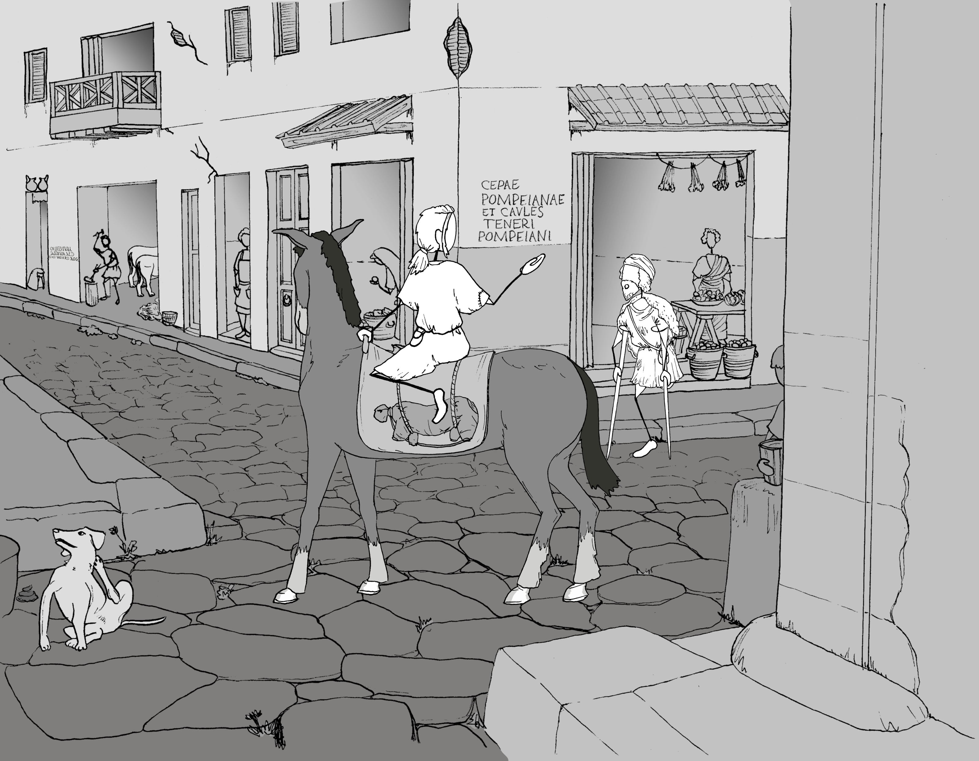 ‘I believe those are mine,’ says Sextus Pompeius Axiochus. For a moment Sophe is speechless. But only for a moment. ‘No, they’re for my patron, Sextus Pompeius Amarantus.’ ‘Look,’ he says pointing to one of the labels on the neck. ‘They’re clearly marked Sextus Pompeius Axiochus.’ But now that the amphorae are up on Potiscus’s back she can’t quite see the labels. Sophe stands firm. ‘I’m sure they’re for my boss. He wants me to bring them back to his bar on Arena Street. He even gave me a dupondius to pay the porter to load them. Where is that porter?’ She looks around but can’t see him anywhere. ‘Also,’ says Axiochus, ‘I believe that’s my mule!’ Sophe begins to protest but then remembers that Amarantus rescued the mule after the earthquake. Perhaps the mule does belong to Axiochus. ‘Bring the mule,’ Axiochus commands one of his slaves. ‘Please!’ cries Sophe, her face hot. ‘Amarantus needs these amphorae delivered now! We’ve been promising everybody a special new wine from Gaza.’ Axiochus looks around and spots the customs inspector. ‘Balbus!’ he cries, ‘this impudent little cutpurse is trying to steal my wine and my mule. Send one of your slaves to give her a good thrashing!’ Sophe doesn’t stop to see what Balbus will do. Instinct born of three years of living rough kicks in. She turns and runs. |